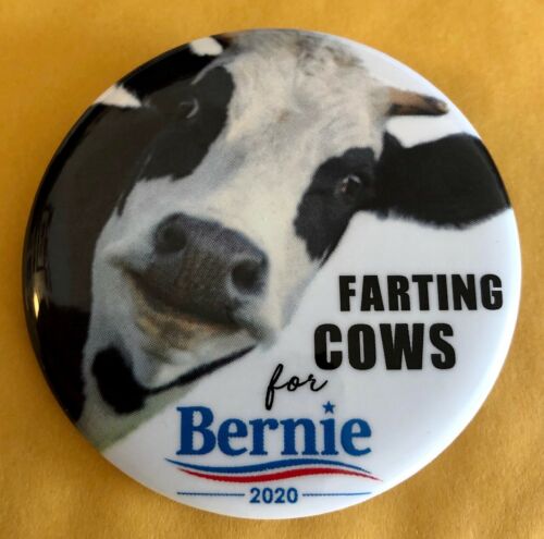 Title (ebay affiliate link): Humorous 2 1/4" Farting Cows for Bernie 2020 Presidential Campaign Pin