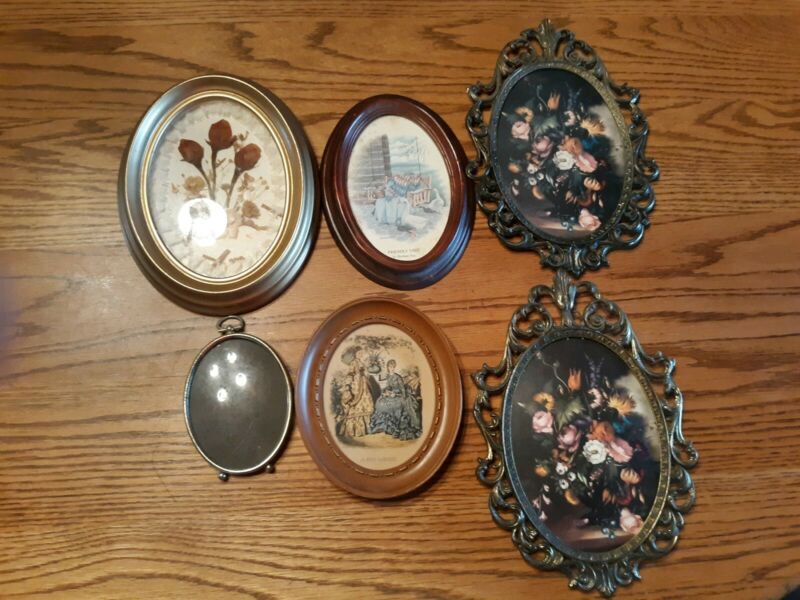 Title (ebay affiliate link): Lot of 6 Vintage Oval Picture Frames Small Ornate Brass + Composite With Glass