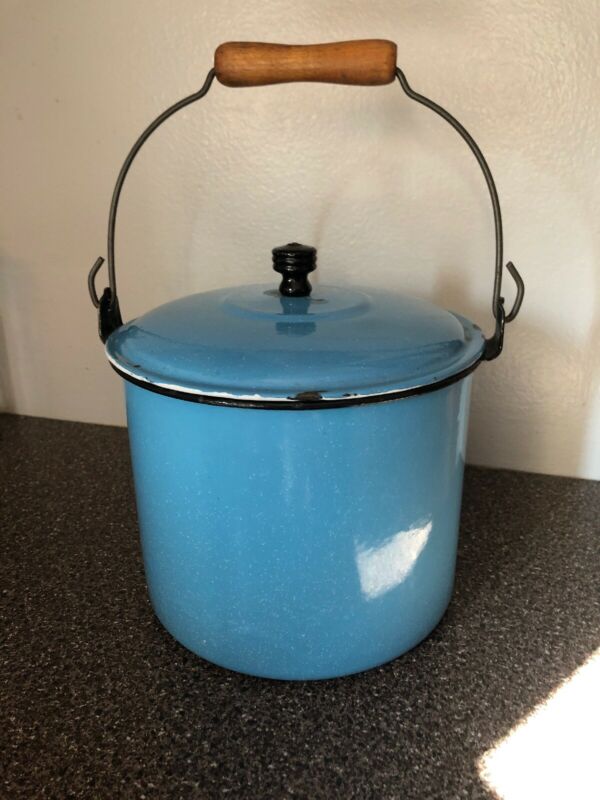 Title (ebay affiliate link): Antique Primitive Rustic Farm BLUE ENAMEL PAIL w/LID Wire &Wood Bale Handle