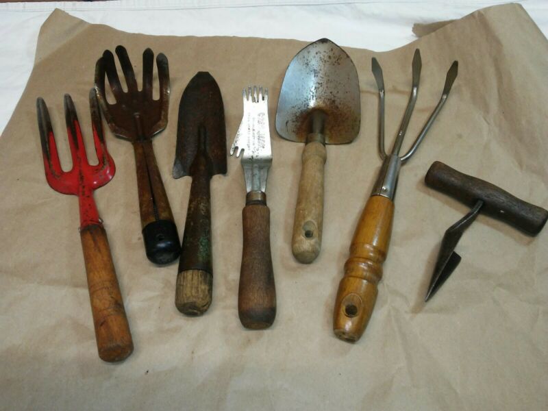 Title (ebay affiliate link): 7 VTG LOT Wood hand tool garden yard claw cultivator digger fork shovel dibber