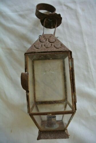 Vtg Rusty Old Tin Glass Lantern 1/2 Moon pattern roof 13" x 3 3/4" sturdy