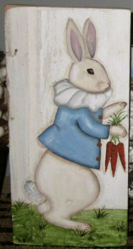 Title (ebay affiliate link): *~*PRIMITIVE*~* HP FOLK ART PRIM BUNNY *~* CARROTS *~* EASTER *~* RECLAIMED WOOD