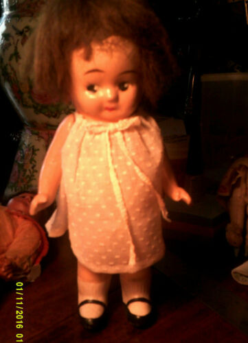 Title (ebay affiliate link): Antique Composition 5.5" Doll, Painted face, Pie Eyes, Dotted Swiss Dress, 50''s?