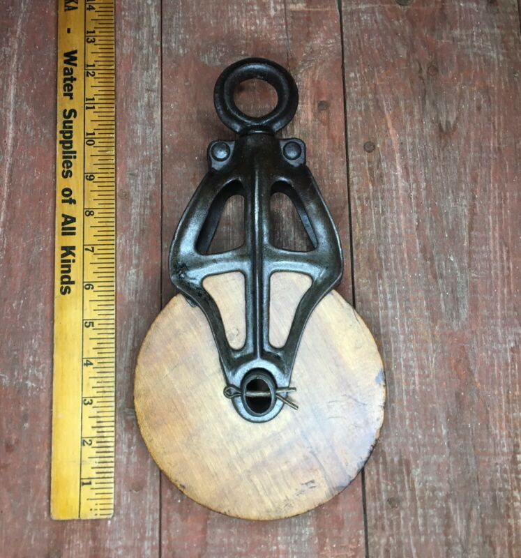 Title (ebay affiliate link): Vtg Antique Cast Iron & Wood Barn Pulley Farm Tool Primitive Hay Trolley Transit