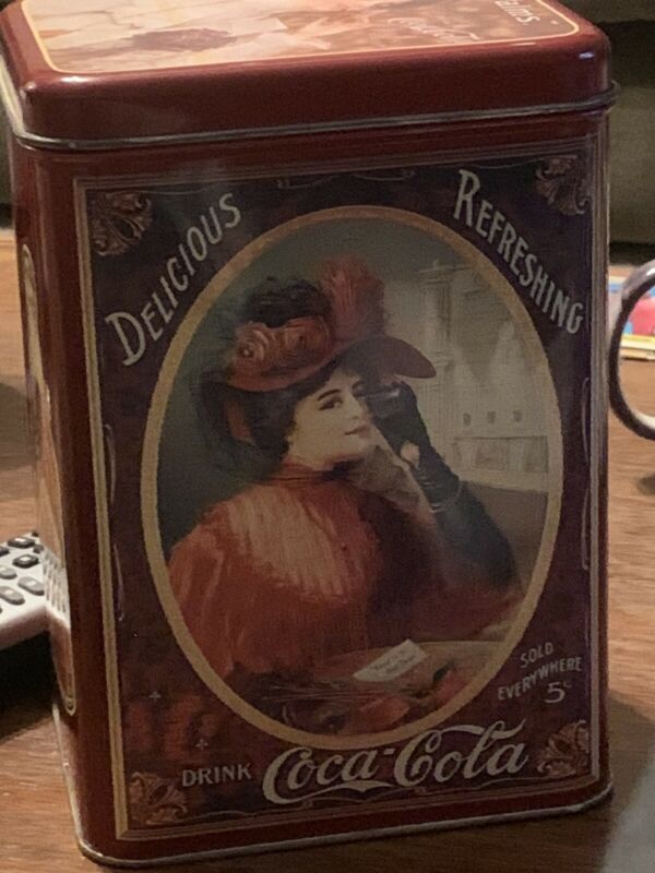 Title (ebay affiliate link): 1994 Rectangular Coca Cola Soda Red Antique Woman Illustration Lidded Tin Box