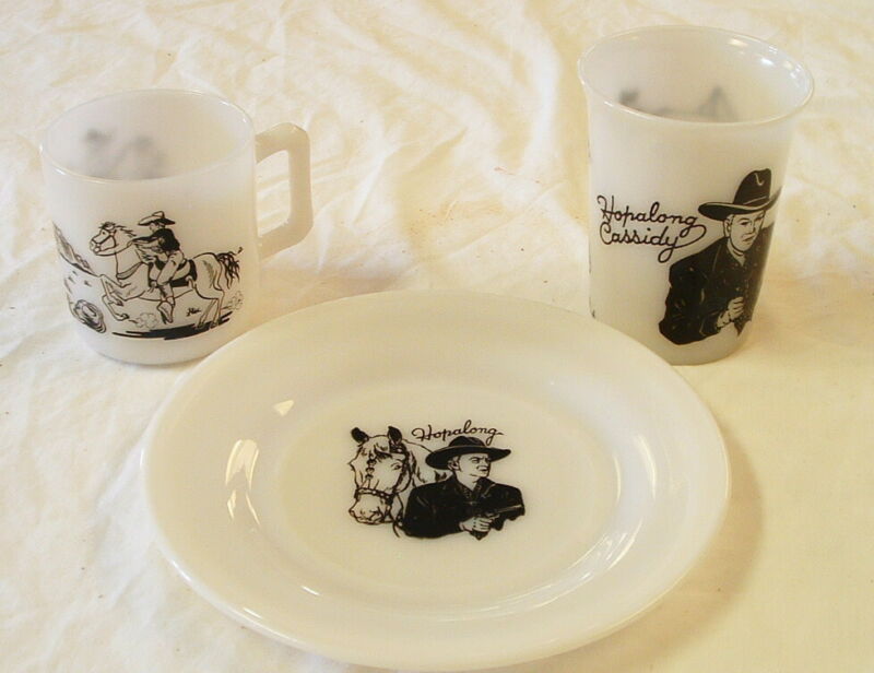 Title (ebay affiliate link): 1950s HOPALONG CASSIDY PLATE AND 2 MILK GLASS CUPS EXCELLENT SHAPE