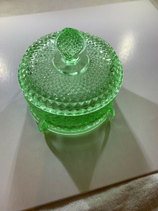Title (ebay affiliate link): Vintage glowing Green Depression Glass Covered Jar