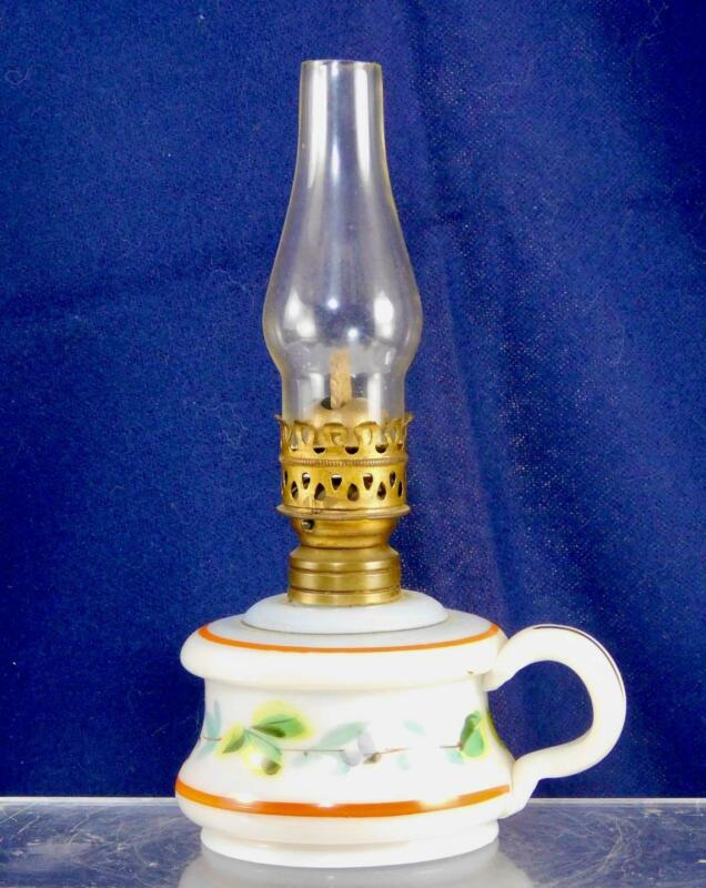 ANTIQUE MINIATURE OIL LAMP w/Finger Holder MILK GLASS and Chimney