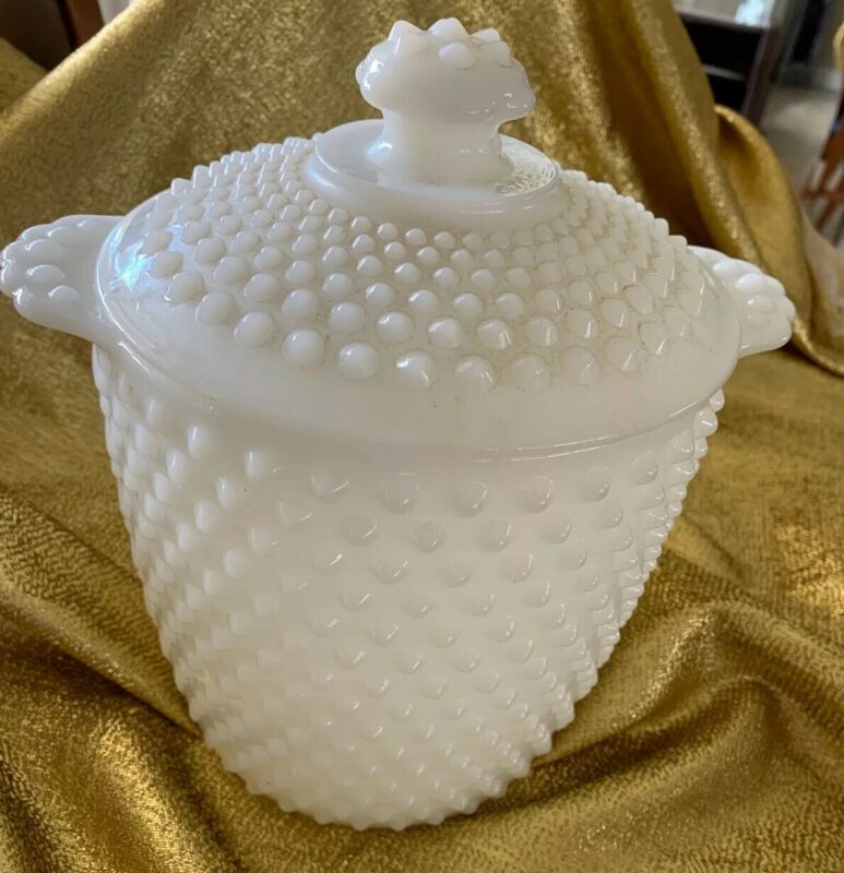 Title (ebay affiliate link): Vintage Hobnail White Milk Glass Canister Lid Cookie Jar Urn Handle Mid Century
