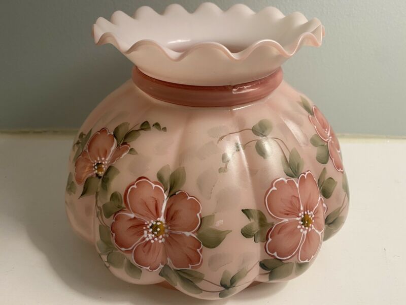 Title (ebay affiliate link): Vtg Hurricane Milk Glass Lamp Shade Hand Painted Pink GWTW Ruffled