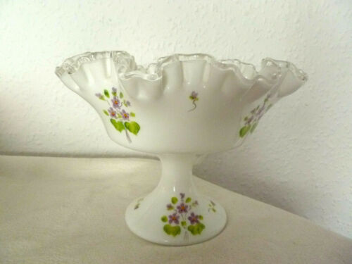 Fenton Hand Painted Violets Silver Crest Milk Glass Footed Bowl Artist Signed