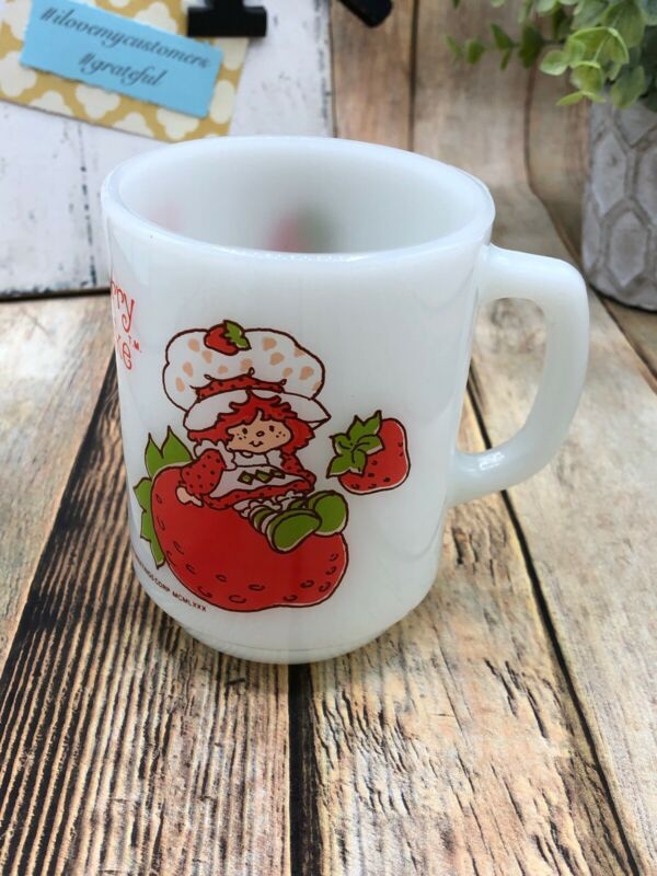 Title (ebay affiliate link): Vintage STRAWBERRY SHORTCAKE Anchor Hocking Fire King Milk Glass Mug Coffee Cup