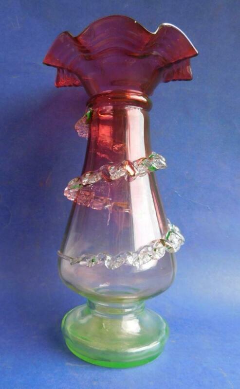 Gorgeous Victorian Uranium & Cranberry Glass Ruffled Rim Vase 1890s
