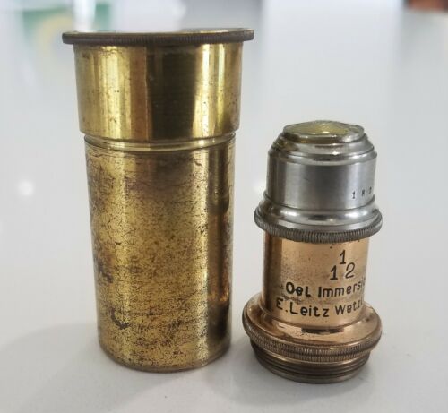 Title (ebay affiliate link): Antique Leitz Wetzlar Microscope 1/12 Oil Immersion Objective and Brass Canister
