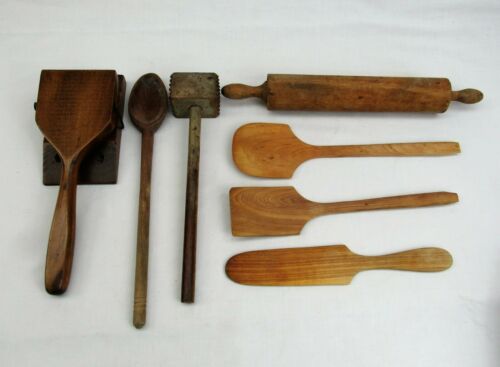 Title (ebay affiliate link): Antique Wooden Ware kitchen primitives paddles spoons rolling pin pounder