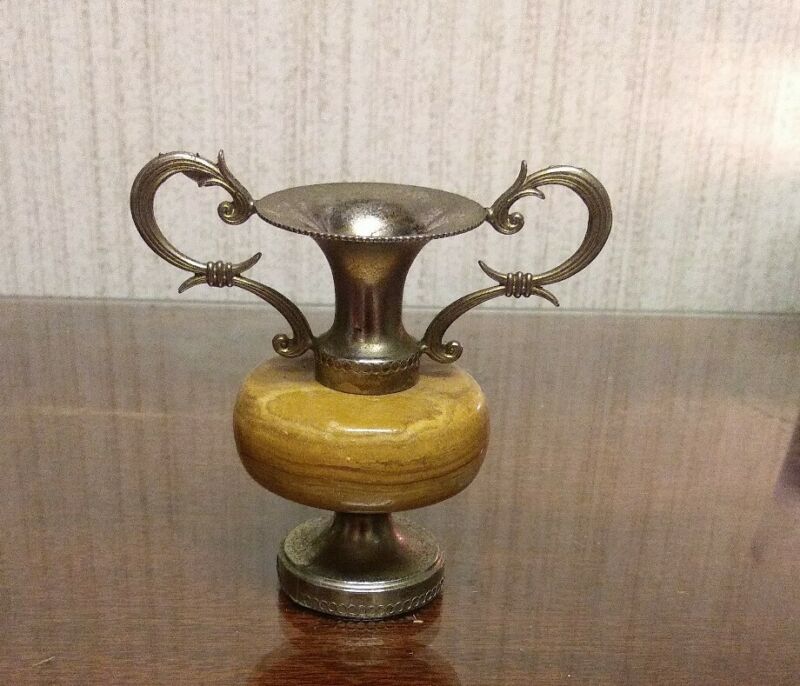 Title (ebay affiliate link): Vintage Deco Paperweight Marble Onix & Brass Metal Miniature Fake Vase 3'''' tall