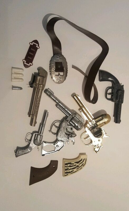 Title (ebay affiliate link): Lot of Vintage Diecast metal Toy Cap Gun Pistol Pal Bullets Belt Parts.