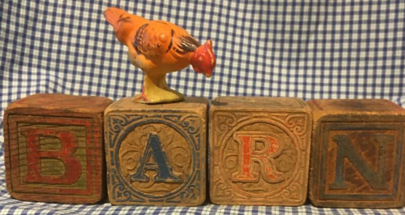 Title (ebay affiliate link): Orig Old illus Toy ABC Wood ~BARN~ Blocks w Antique Bisque Rooster Figurine Lot