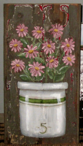 Title (ebay affiliate link): *~*PRIMITIVE*~* HP FOLK ART PRIM CROCK OF DAISIES *~* RECLAIMED WOOD