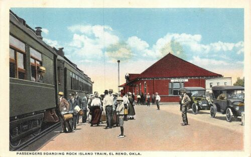 Title (ebay affiliate link): El Reno, CA-Railroad Station & Autos-Passengers Boarding Rock Island Line Train