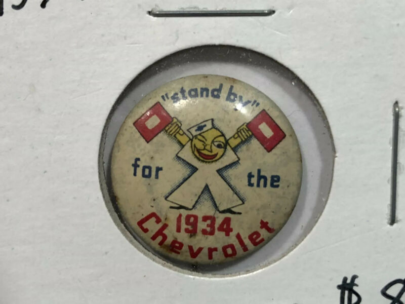 Title (ebay affiliate link): 1934 TIN LITHO CHEVROLET PINBACK BUTTON ADVERTISING STAND BY FOR THE Chevrolet