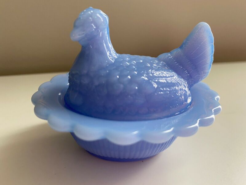 Title (ebay affiliate link): SMALL Vintage Light Blue Opaque Milk Glass Chicken Hen in a Basket Nest Dish