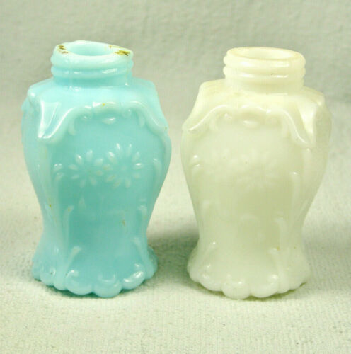 Antique White and Blue Opaque Milk Glass Shakers - Scroll Corners & Daisies