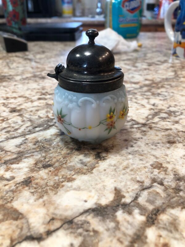 Title (ebay affiliate link): ANTIQUE MILK GLASS EMBOSSED FLORAL & PAINTED FLOWERS PATTERN WITH HINGED TOP