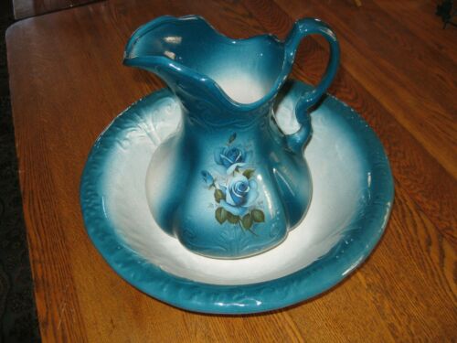 Title (ebay affiliate link): Antique Vtg Ironstone Pottery Pitcher & Basin Bowl Floral Turquoise Blue Roses
