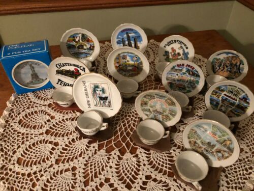 Vtg Miniature Souvenir Cups and Saucers With Plastic Stands Lot of 12 sets