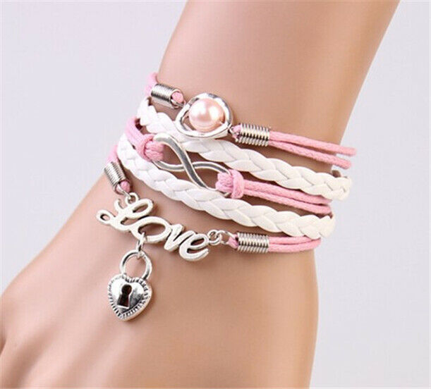 Title (ebay affiliate link): NEW Infinity Love Heart Key Friendship Antique Silver Leather Charm Bracelet