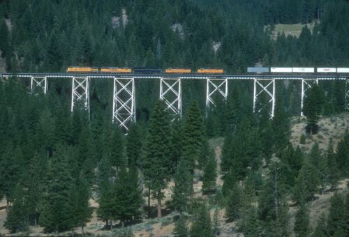 Title (ebay affiliate link): Original Kodachrome Slide of a UP Freight on the Clio Viaduct on the former WP