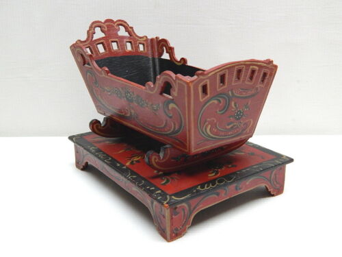 Antique Norway Norwegian Wood Hand Painted Rosemaling Miniature Cradle & Stand
