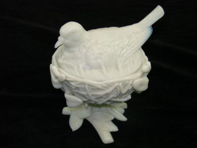 Vintage White Milk Glass BIRD ON NEST Bowl & Lid Set