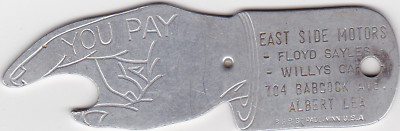 WILLYS CARS EAST SIDE MOTORS ALBERT LEA BOTTLE OPENER