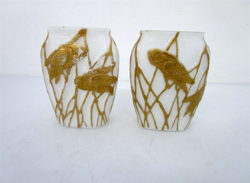 Pair 6" Milk Glass Vases w/ Gold Owls In Relief