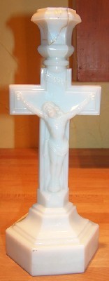 NEW ENGLAND MILK GLASS CRUCIFIX CANDLESTICK, c. 1860
