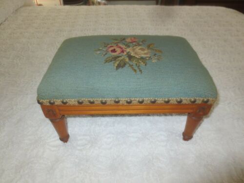 Antique FLORAL NEEDLEPOINT Carved WOOD FOOT STOOL w/Braid & Tack Trim - 13" x 9"