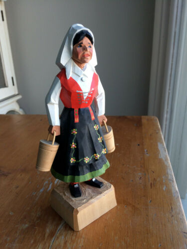 Title (ebay affiliate link): Norway-Form Wooden Hand Carved Norwegian Bunad Girl Flowered Apron Buckets 8"
