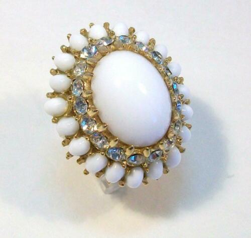 Signed Vintage JOMAZ Rhinestone & Large Milk Glass Cabochon RING - Size 7.25