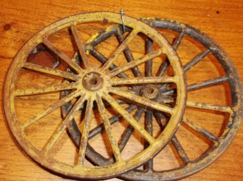 Title (ebay affiliate link): Miniature PAIR iRON Painted Yellow WHEELS for cart, carriage AAFA