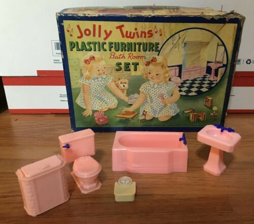 Title (ebay affiliate link): 1946-47 JOLLY TWINS RENWAL BATHROOM SET COMPLETE W/SCALE DOLL HOUSE FURNITURE