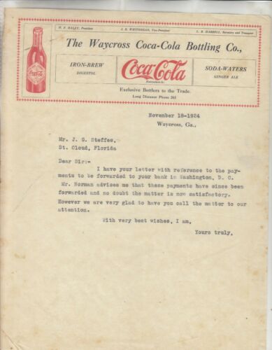 Title (ebay affiliate link): THE WAYCROSS COCA-COLA BOTTLING CO. LETTERHEAD NOVEMBER 18, 1924 90 YEARS OLD