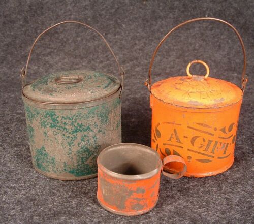 Title (ebay affiliate link): 2 Antique Tin Lidded Buckets "A Gift" Candy Container Christmas Tree Ornaments