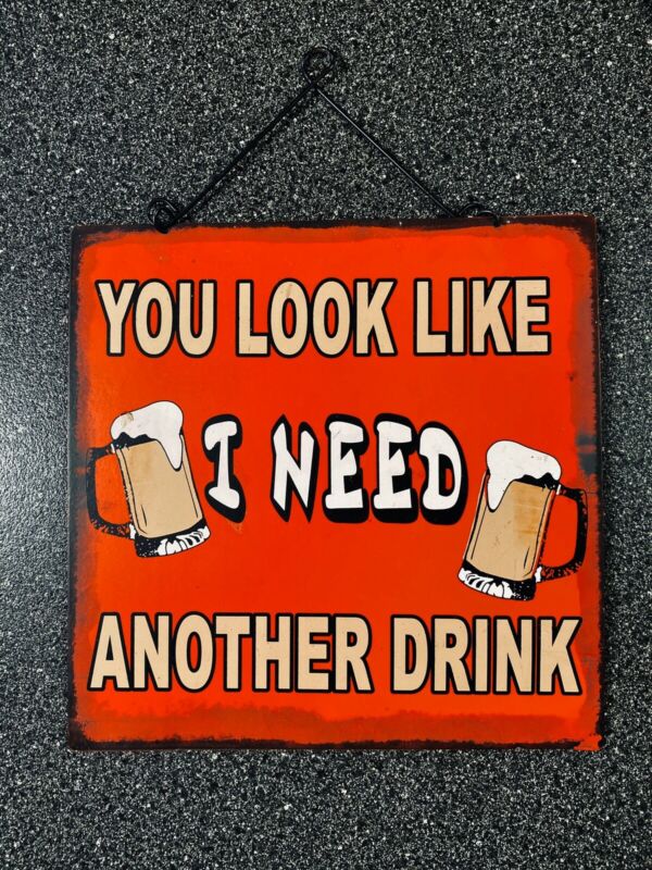 Title (ebay affiliate link): Vintage Sign Metal You Look Like I Need Another Drink Ice Cold Beer Mugs Red