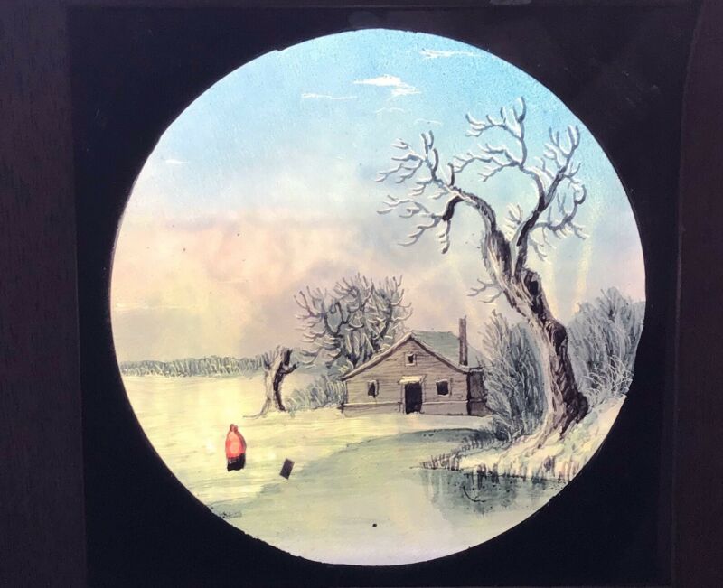Title (ebay affiliate link): Antique Hand-Painted Glass Lantern Slide WINTER In Wooden Frame.