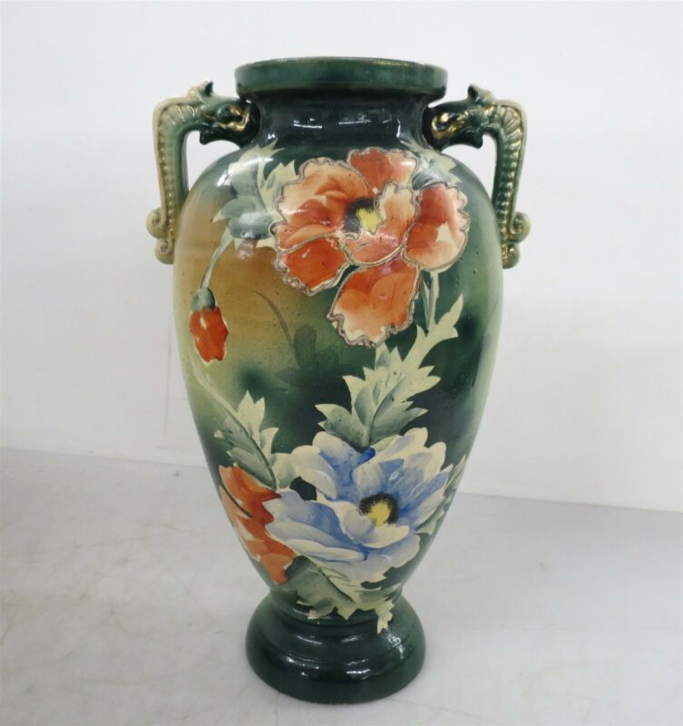 Vintage Handpainted 14" Floral Double Handle Vase Stoneware