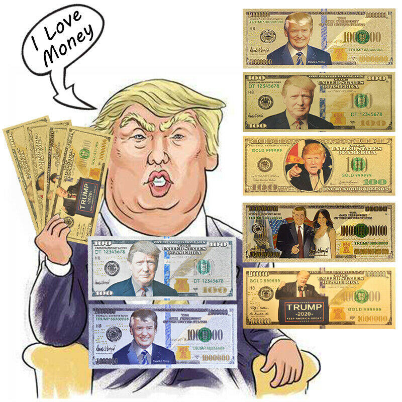 Title (ebay affiliate link): WR 7pcs Donald Trump 2020 Gold Silver Foil Banknote Dollars US The First Lady
