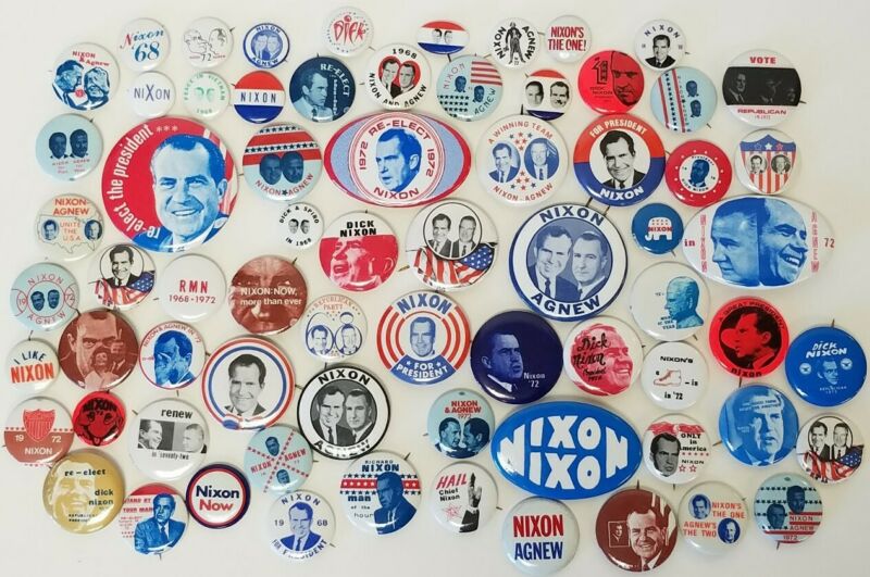 Title (ebay affiliate link): Huge Lot of 70 Richard Nixon Presidential Campaign Pinback Buttons 1968 & 1972