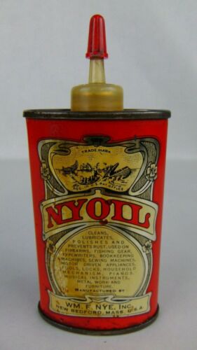 Title (ebay affiliate link): NYOIL VINTAGE OIL TIN USA AMERICAN MADE OLD OILER TIN GUN OIL LUBRICATING OIL